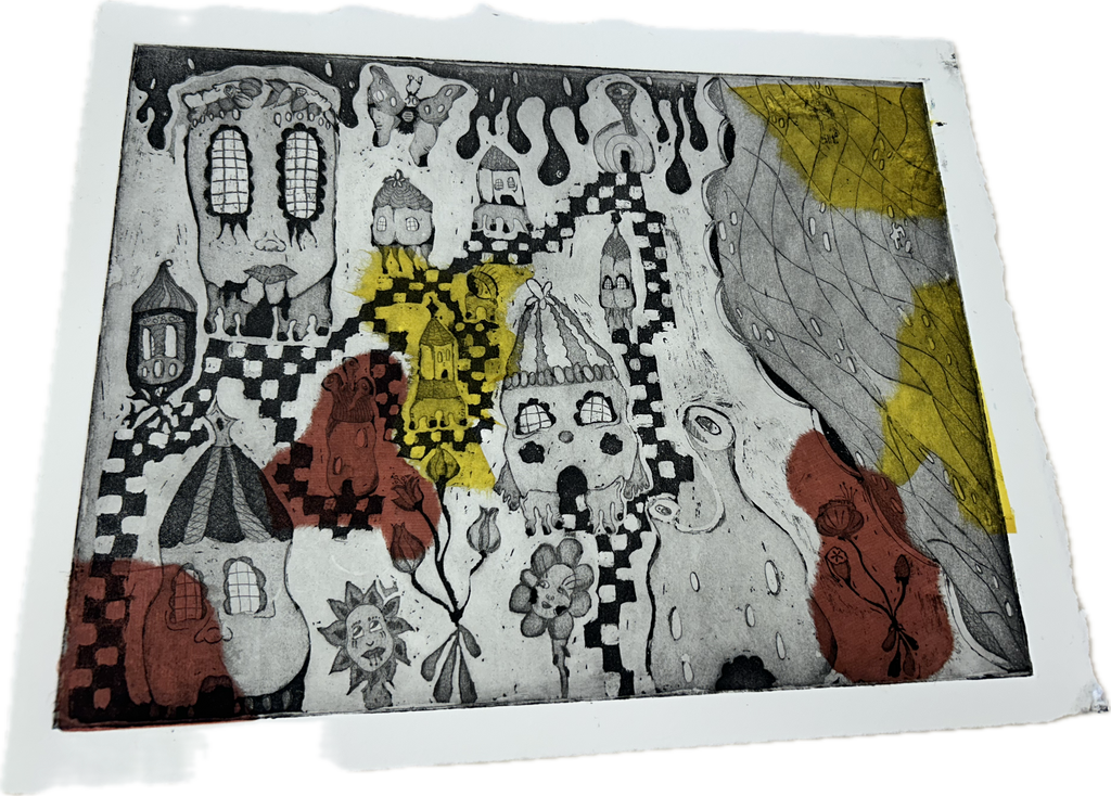 Copies of my Original Neighborhood hard ground etching with chine collé.